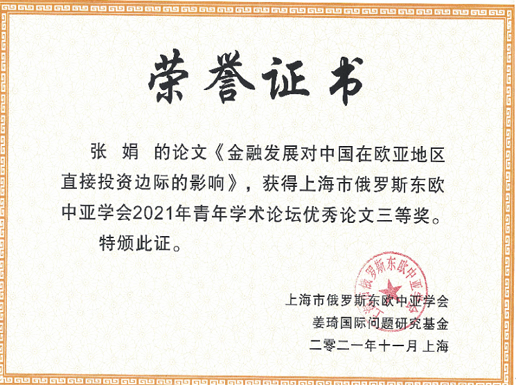 11月19日,張娟、劉鉆石. 論文《金融發展對中國在歐亞地區直接投資邊際的影響》,獲得上海市俄羅斯東歐中亞學會2021年青年學術論壇優秀論文,三等獎,2021年11月