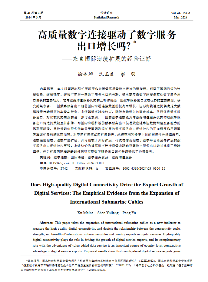 徐美娜, 沈玉良, 彭羽. 高質量數字連接驅動了數字服務出口增長嗎?——來自國際海纜擴展的經驗證據[J]. 統計研究, 2024, 41 (03): 100-114.