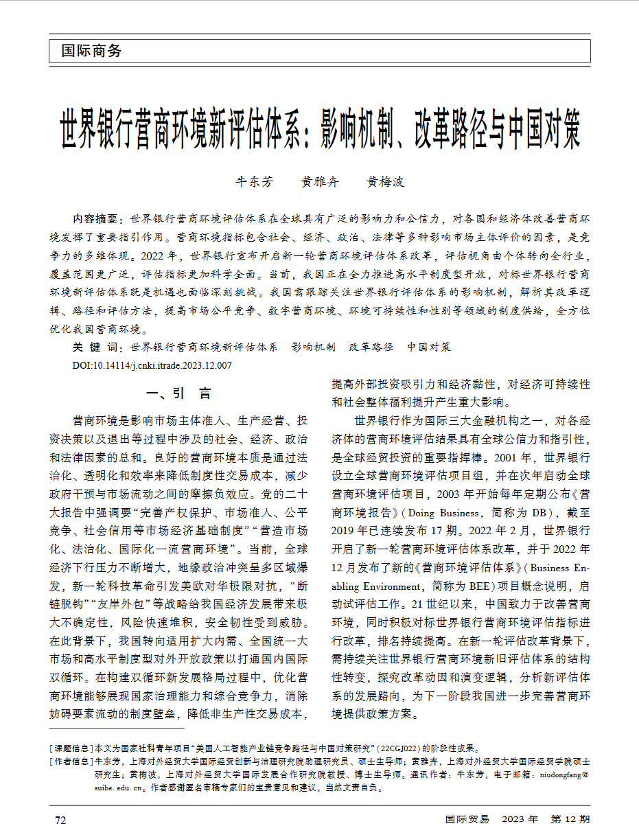 牛東芳, 黃雅卉, 黃梅波. 世界銀行營(yíng)商環(huán)境新評(píng)估體系:影響機(jī)制、改革路徑與中國(guó)對(duì)策[J]. 國(guó)際貿(mào)易, 2023, (12): 72-83.