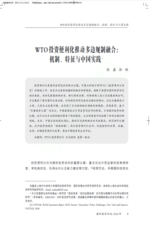 張磊,徐琳. WTO投資便利化推動多邊規制融合:投資、特征與中國實踐[J]. 國際經濟評論, 9-33.