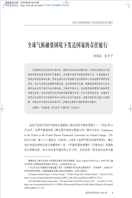 黃梅波, 張宇寧. 全球氣候融資困境下發達國家的責任履行[J]. 國際經濟評論, 1-31.