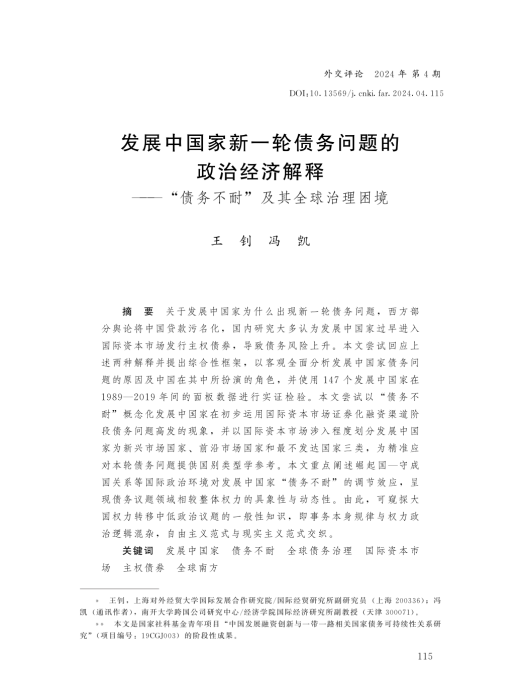 王釗, 馮凱. 發(fā)展中國家新一輪債務(wù)問題的政治經(jīng)濟解釋——“債務(wù)不耐”及其全球治理困境[J]. 外交評論(外交學(xué)院學(xué)報), 2024, 41 (04): 115-154+169.