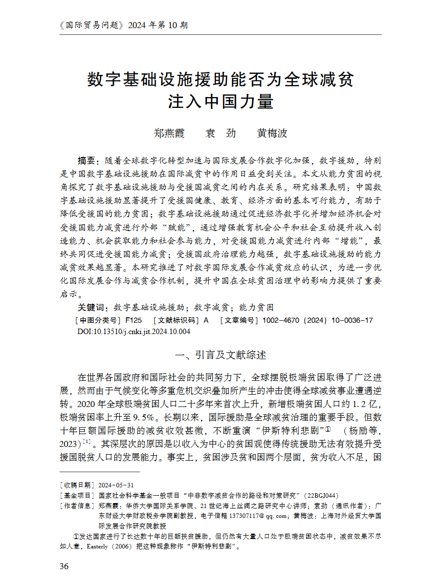 鄭燕霞,袁 勁,黃梅波.數(shù)字基礎(chǔ)設(shè)施援助能否為全球減貧注入中國力量,國際貿(mào)易問題,2024(4)