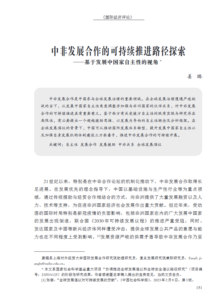 姜璐:“中非發展合作的可持續推進路徑探索——基于發展中國家自主性的視角”,《國際經濟評論》,2024年第6期。