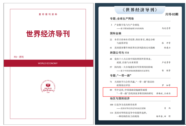 近日,國際發展合作研究院院長黃梅波教授與2022級應用經濟學博士生、國際經貿學院國際發展合作專業王婕佳同學合作完成的學術論文《雪中送炭:中國基礎設施融資減緩“一帶一路”沿線國家多維貧困的研究》,獲人大復印報刊資料《世界經濟導刊》2025年第3期全文轉載。這是對該論文在國際發展合作研究領域的學術價值與現實意義上的高度認可,也充分展現了我院在應用經濟學博士研究生培養方面的卓越成效。