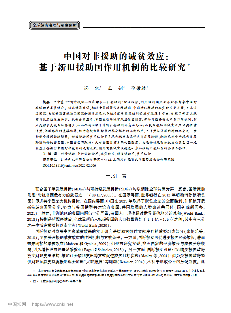 馮凱,王釗*,李榮林.中國對非援助的減貧效應:基于新舊援助國作用機制的比較研究[J].世界經濟研究,2025,(02):12-27.