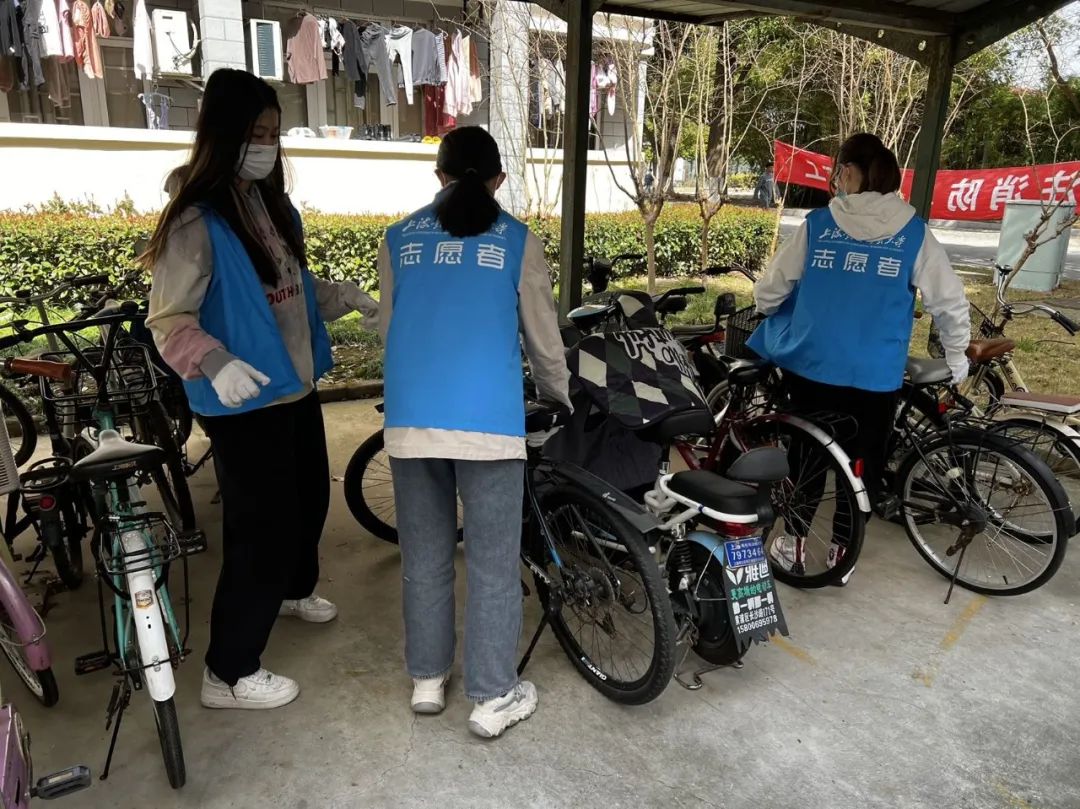 自行車整理崗位上,在組織者的領導下,各位志愿者組成小隊,在社區(qū)的各個自行車停車位上扶起倒地的自行車,調整自行車的擺放位置。盡管偌大的宿舍區(qū)中有很多倒地的、不正規(guī)擺放的自行車,志愿者們依然仔細地檢查了每一片區(qū)域,確認擺放穩(wěn)固之后才前往下一處地點。