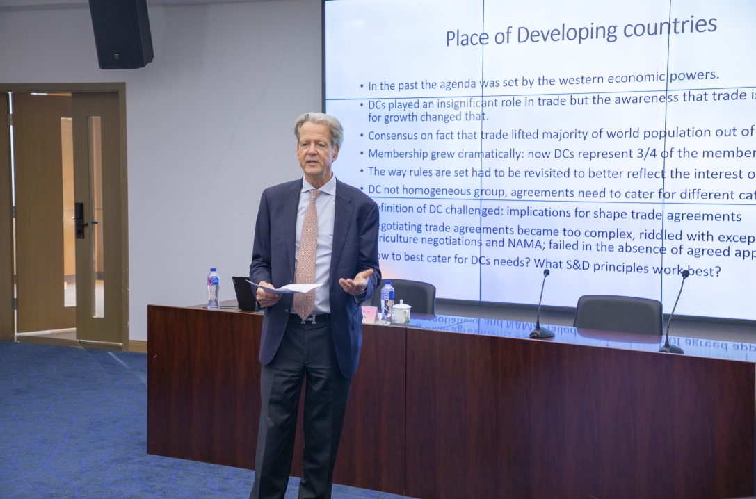 2023年11月7日,上海對外經貿大學客座教授暨世界貿易組織講席高級顧問Maarten Smeets教授來訪我校,并為我校師生舉辦了主題為“Trade negotiations in the WTO with special reference to plurilaterals”的專題講座。講座由WTO亞太培訓中心執行主任、貿易談判學院副院長應品廣主持。