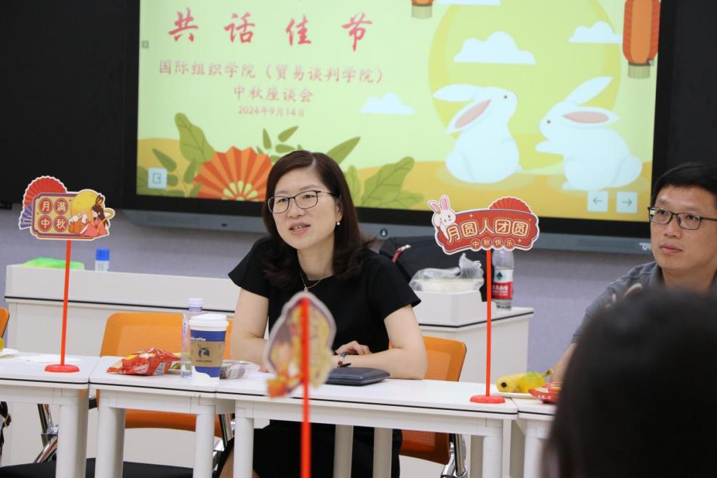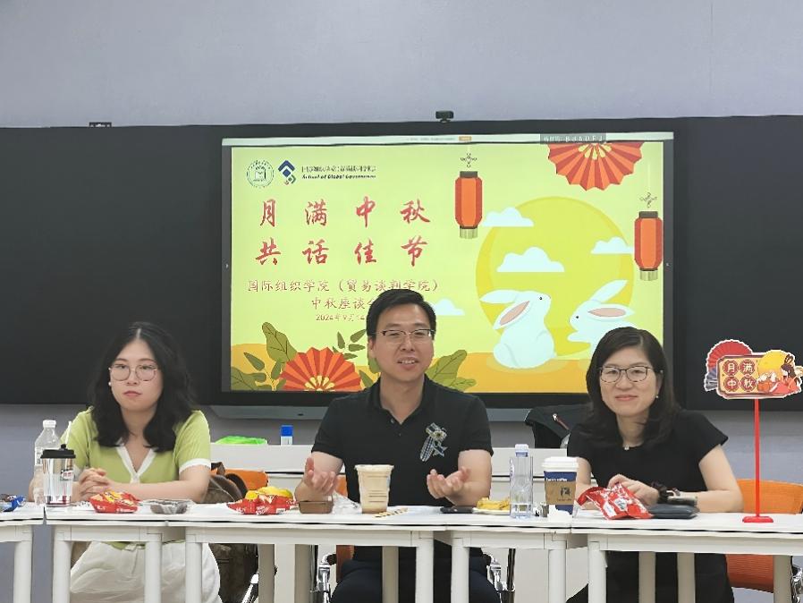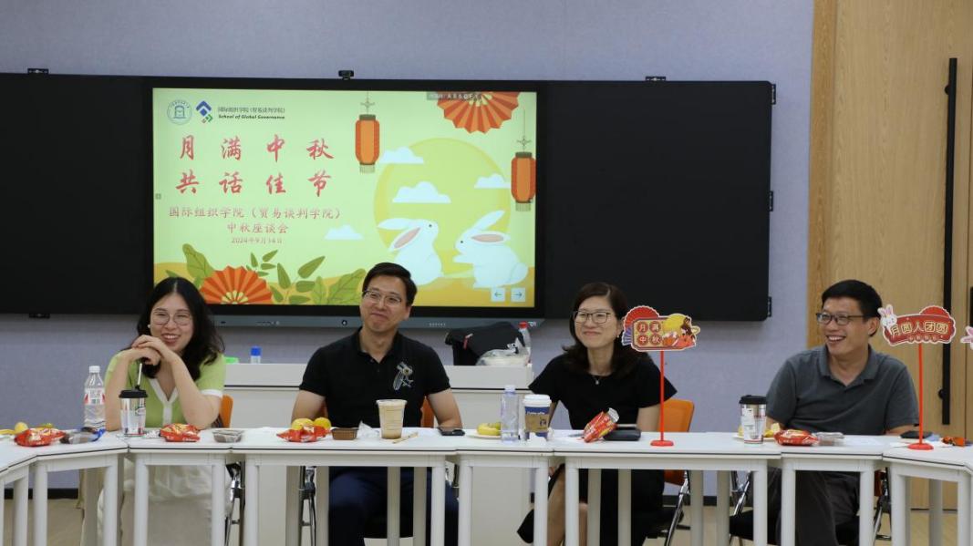 9月14日中午,在中秋佳節即將到來之際,國際組織學院(貿易談判學院)在信息樓213研討室舉行師生中秋茶話會。學院黨委書記劉素貞,院長應品廣,黨委副書記程棟,教師魯斯齊、王元昆、辛雅文、郭歌,與2024級本碩新生代表齊聚一堂,共同慶祝傳統佳節,共話理想與未來。座談會由程棟主持。