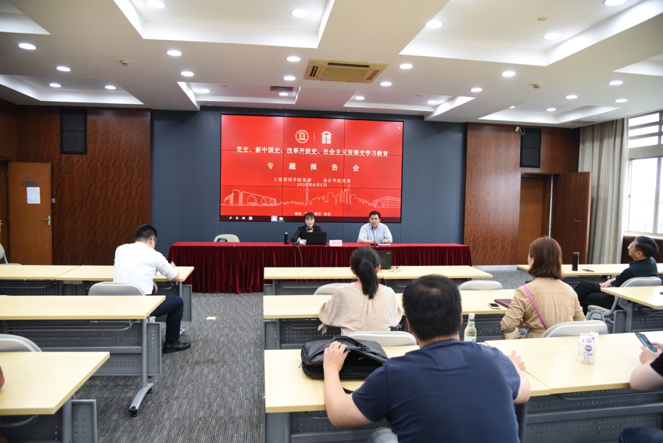 6月5日下午,工商管理學院黨委和會計學院黨委以線上線下同步進行的方式邀請學校“四史”專家宣講團成員、馬克思主義學院副院長庾向芳老師開展題為《學習“四史”,鑒往知來》的專題輔導報告。庾向芳副院長在報告中深刻闡述了當下學習“四史”的必要性,圍繞為什么要學“四史”,“四史”的核心要義是什么,怎樣學“四史”三個方面進行了系統解釋。要求我們從歷史的學習中深刻認識和理解初心和使命,要總結歷史經驗,把握歷史規律,才能更好地開拓前進,走向未來。同時,庾老師引用了翔實的史料,多角度講述了我們黨波瀾壯闊的發展歷程,對學習“四史”分享了經驗方法。
