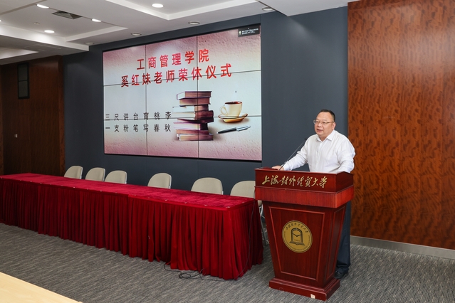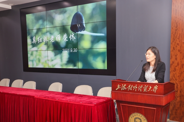 儀式伊始,播放了學院工會精心制作的回顧奚老師在校工作與生活的視頻。隨后姜秀珍院長代表學院全體師生向奚紅妹教授致以崇高的敬意和衷心的感謝。姜院長概括回顧了奚老師這位地地道道的“貿大人”為學院事業做出的卓越貢獻,希望奚老師今后繼續關心與支持學院事業發展,繼續提攜與引領學院青年教師;希望學院青年教師積極向前輩學習,努力做上海對外經貿大學的大先生、做管理學領域的大學者!隨后工商管理學院副院長、市場營銷系主任謝佩洪、營銷系教工黨支部書記李蒞、教師代表徐波、史楠等相繼發言,回顧了與奚老師一起工作的經歷。儀式過程中掌聲陣陣,情意濃濃。
