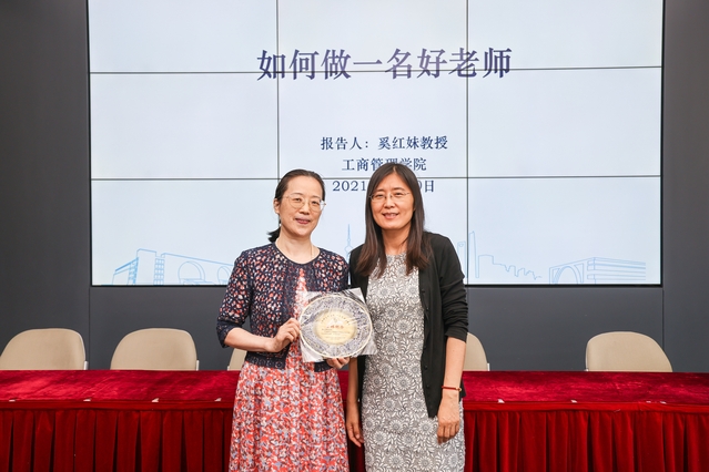 儀式上還播放了校友代表的視頻祝福。隨后,奚紅妹老師深情回顧了對管院每一位成員的深情厚誼,并以“如何做一名好教師”為主題,與大家分享了教學這門藝術的心得。她說:“教學是一門考究的藝術,我們的一言一行,一舉一動都在向學生傳遞著信息,學生接受了信息后能否作出積極反應,取決于教學的審美意境。我非常喜歡聽京劇,名角唱腔令我著迷。要是我的教學能夠像京劇一樣,余音繚繞,唱腔跌宕起伏,氣息綿延千里,那該多好啊!所以我琢磨每一節課的起承轉合,力求張弛有度,大開大合。為什么要讓教學上升到藝術高度?因為美令人著迷,因為美令人向往,因為美催人行動。學生被知識感染了,才會向往知識探究,激發學習熱情。教學是座巍峨的高山,我仍在山腳下。在座的每位老師到我這個年紀定能登上山峰,我為你們喝彩。”