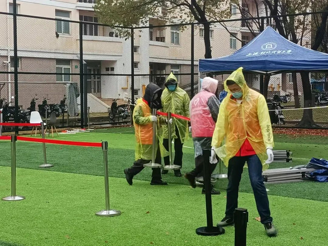 為進一步加強社區疫情防控力度,全方位做好后勤保障工作,工商管理學院師生積極配合社區物業投身到核酸檢測場地搭建工作中。2022年3月21日,在黨支部書記崔延順老師的帶領下,工商管理學院的志愿者同學們有序進入到社區足球場,在雨中開始了場地的布置。惡劣的天氣并沒有影響到學院師生的服務熱情,在雨中學院老師和同學們身著紅色馬甲和雨衣進行分工合作,高效的完成了場地和道路的劃分、帳篷的搭建,以實際行動奏響了疫情防控阻擊戰的“沖鋒號”。工商管理學院師生志愿者們全力以赴,為學校順利開展新一輪核酸檢測、筑牢學校師生健康和安全防線奉獻了自己的堅實力量。