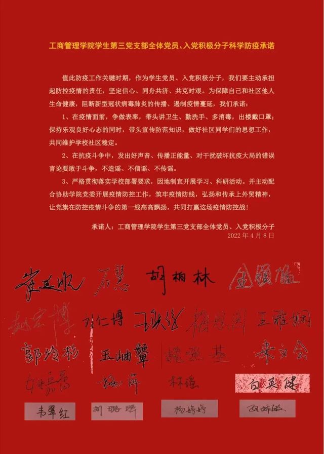 每一名入黨積極分子簽訂《工商管理學院防疫承諾書》,積極響應上海市委和學校的防疫號召及《上海市致全市黨員的一封信》,主動學習、沖鋒在前、擔當作為。