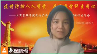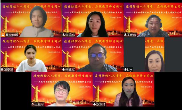 一個支部就是一座堡壘,一名黨員就是一面旗幟。為積極響應上級黨委組織的防疫精神,更好的發揮黨員的先鋒帶頭作用,2022年4月29日,在學校疫情防控統一部署和學院黨委的領導下,工商管理學院文化產業管理系教工黨支部書記程鵬璠號召全體支部黨員,結合學校疫情防控工作要求積極開展在線學習和工作交流。會議上支部黨員們認真貫徹落實習近平總書記重要講話精神和市委組織部對全市黨員的要求號召,統一思想、凝聚共識,堅定了“疫情防控人人有責,線上教學師生同心”的思想戰線。