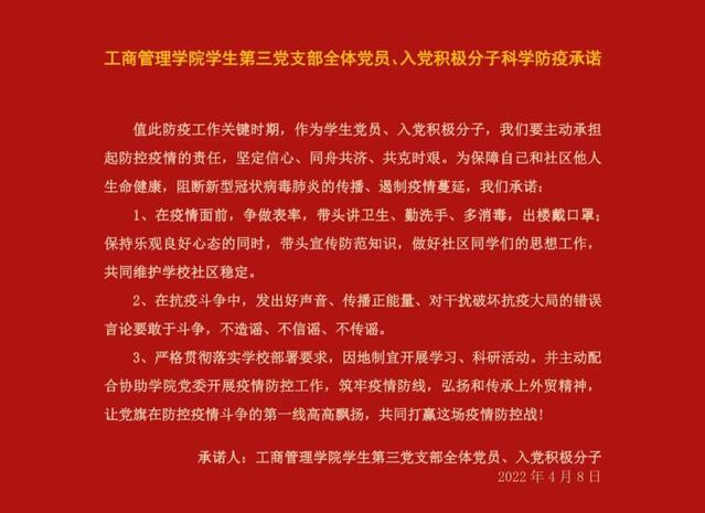 入黨積極分子簽訂《工商管理學院防疫承諾書》,主動參與校園志愿服務活動,加強學習、沖鋒在前、擔當作為。組成“初心故事宣講團”,開展《信仰的力量——疫情期間身邊黨員故事講述》,將身邊黨員故事傳遞給全體學生。