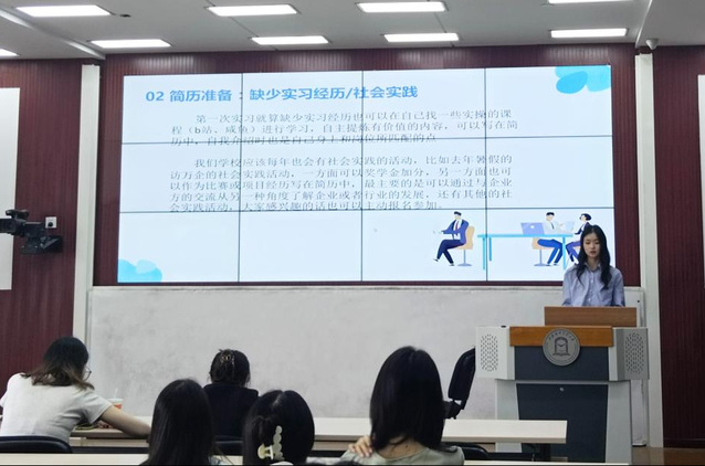 王祎璠學姐以“實習與就業準備”為主題,從就業準備、簡歷準備、面試技巧、實習收獲四個方面進行了詳細的分享。她首先強調了就業準備的重要性,提醒同學們要明確自己的實習目的和發展方向。在簡歷準備方面,她分享了如何撰寫一份突出個人優勢和特點的簡歷,以及如何通過簡歷展示自己的專業技能和工作經驗。在面試技巧方面,她結合自己的求職經歷,分享了一些實用的面試技巧和注意事項。最后,她還分享了自己在實習過程中的收獲和體會,鼓勵同學們珍惜實習機會,積累實踐經驗。