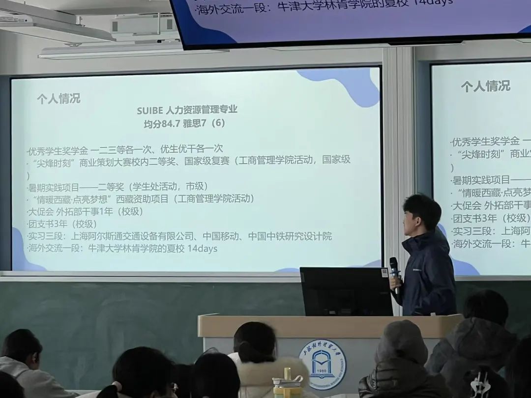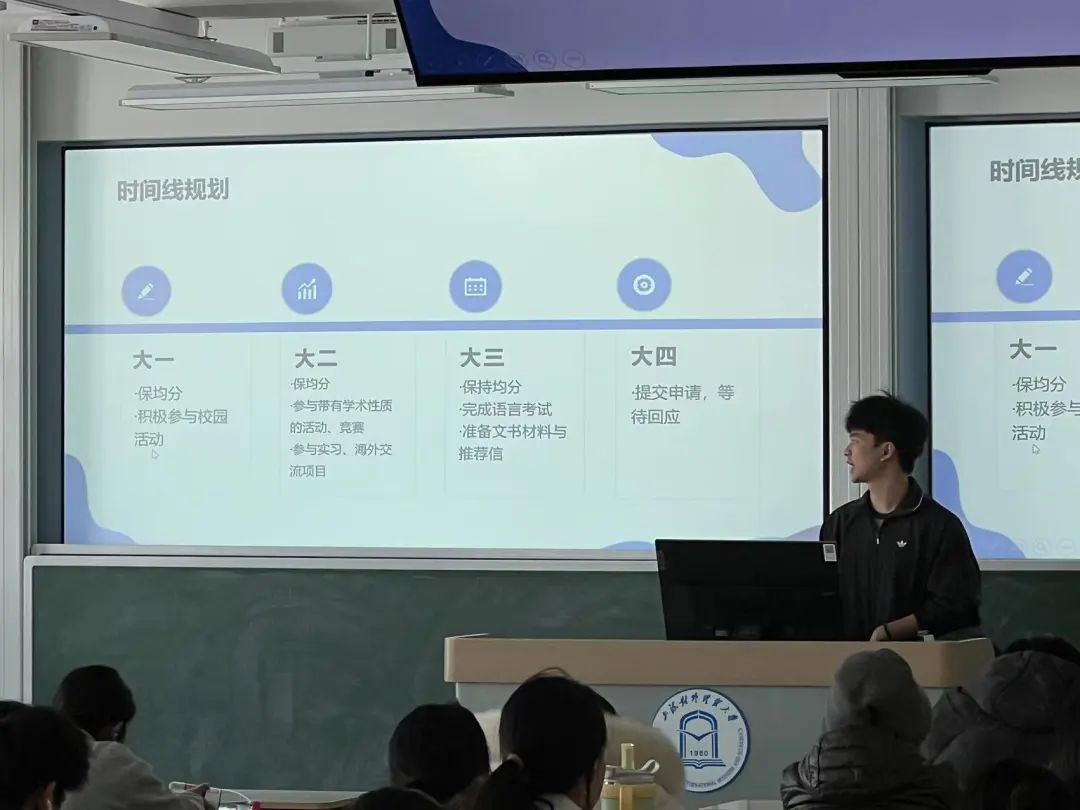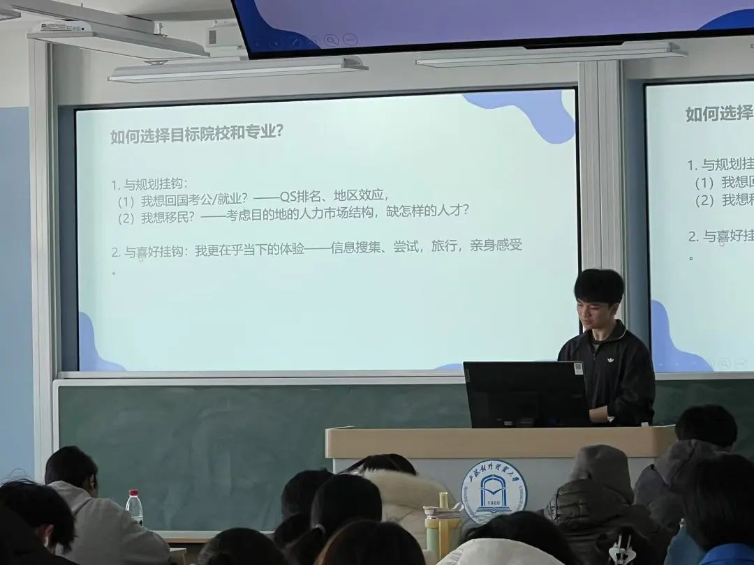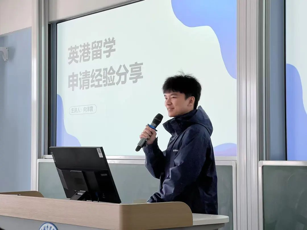 向澤霖同學(xué)由自身引入,分別從校內(nèi)成績(jī)、獲獎(jiǎng)情況、實(shí)踐經(jīng)歷等方向,為同學(xué)們展示英港留學(xué)申請(qǐng)的 “通關(guān)秘籍”。他詳細(xì)講解了如何充分利用豐富的校內(nèi)資源,例如專業(yè)的課程體系、優(yōu)質(zhì)的師資力量和多樣的實(shí)踐機(jī)會(huì),更好地為留學(xué)做準(zhǔn)備。此外,向澤霖同學(xué)還分享了真實(shí)詳盡的個(gè)體申請(qǐng)案例,涵蓋選課寶典和時(shí)間線規(guī)劃等,為同學(xué)們提供了極具參考價(jià)值的借鑒和啟發(fā)。