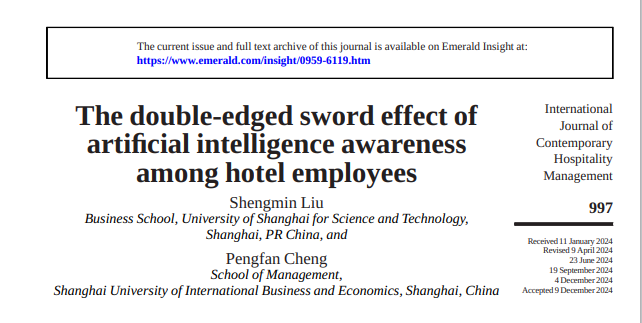 近期,工商管理學(xué)院程鵬璠老師合作撰寫的《The double-edged sword effect of artificial intelligence awareness among hotel employees》一文發(fā)表于《International Journal of Contemporary Hospitality Management》2025年第37卷。該期刊為JCR Q1分區(qū)的SSCI來源期刊,是旅游管理科學(xué)國際五大頂尖期刊之一,被我校列為國際二類,A級(jí)期刊。