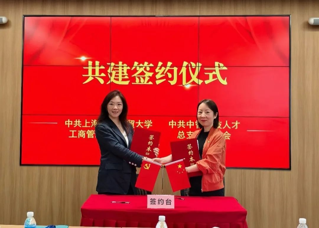 為探索黨建引領下的校企協同育人新路徑,推進基層黨建工作統籌聯動,5月16日下午,上海對外經貿大學工商管理學院與上海市科技人才資源中心有限公司在中智大廈舉行了共建簽約暨授牌儀式。工商管理學院黨委副書記張瑞娟、人力資源管理系系主任王莉紅、專業教師郝欣宇、輔導員崔延順、學院學生代表以及中智科技人才公司相關負責人共同出席,本次活動由中智科技人才黨總支書記許芹主持。