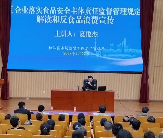 為進一步落實校園食品安全管理責任,提升我校后勤工作人員的食品安全意識和治理能力,保障廣大師生的飲食安全和身體健康。4月27日,后勤綜合管理處特邀廣富林市場監督管理所副所長夏俊杰來校做“食品安全”專題講座。后勤綜合管理處各條線工作人員參加。