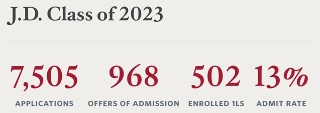 哈佛大學(xué)法學(xué)院創(chuàng)立于1817年,是美國最古老的法學(xué)院。J.D(Doctor of Jurisprudence)學(xué)習(xí)項目系以提供三年美國基礎(chǔ)法學(xué)教育為目的,申請者必須具有學(xué)士以上的學(xué)位,原則上不具有法律背景,并以美國學(xué)生為絕大多數(shù),少數(shù)非美國籍者。本次申請季共有7505個申請者,錄取率僅為13%,其中非美國籍國際學(xué)生僅有17位錄取者。