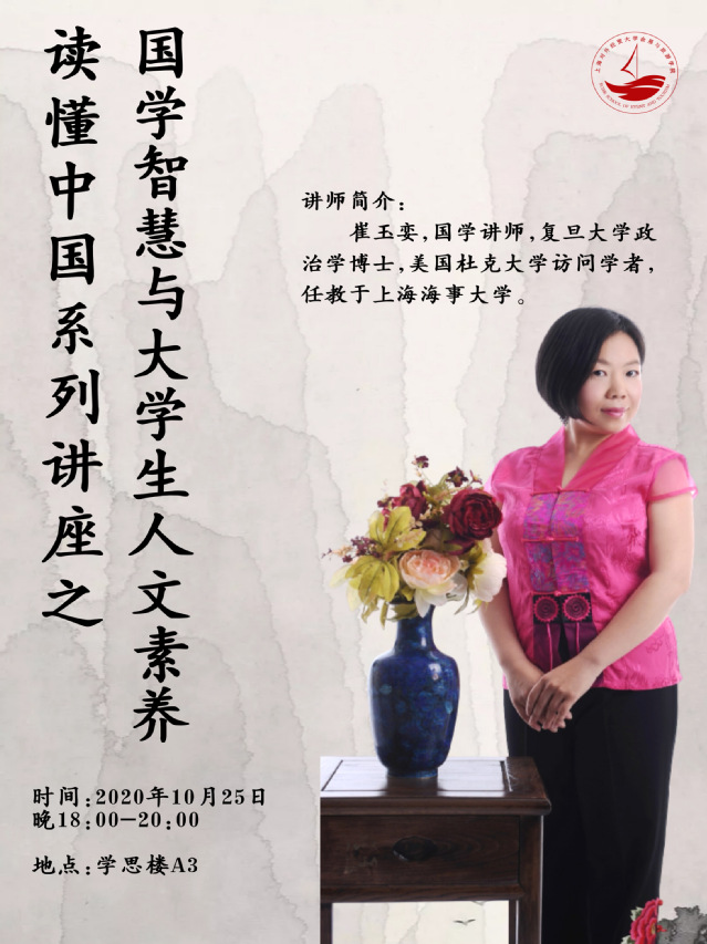 為全面提升2020級預科生新生的綜合素養,加強愛國主義教育,會展與旅游學院啟動了新學年讀懂中國專題系列講座,10月25日 第一期講座《國學智慧與大學生人文素養》由國學講師、上海海事大學崔玉孌博士在學思樓A3主講。