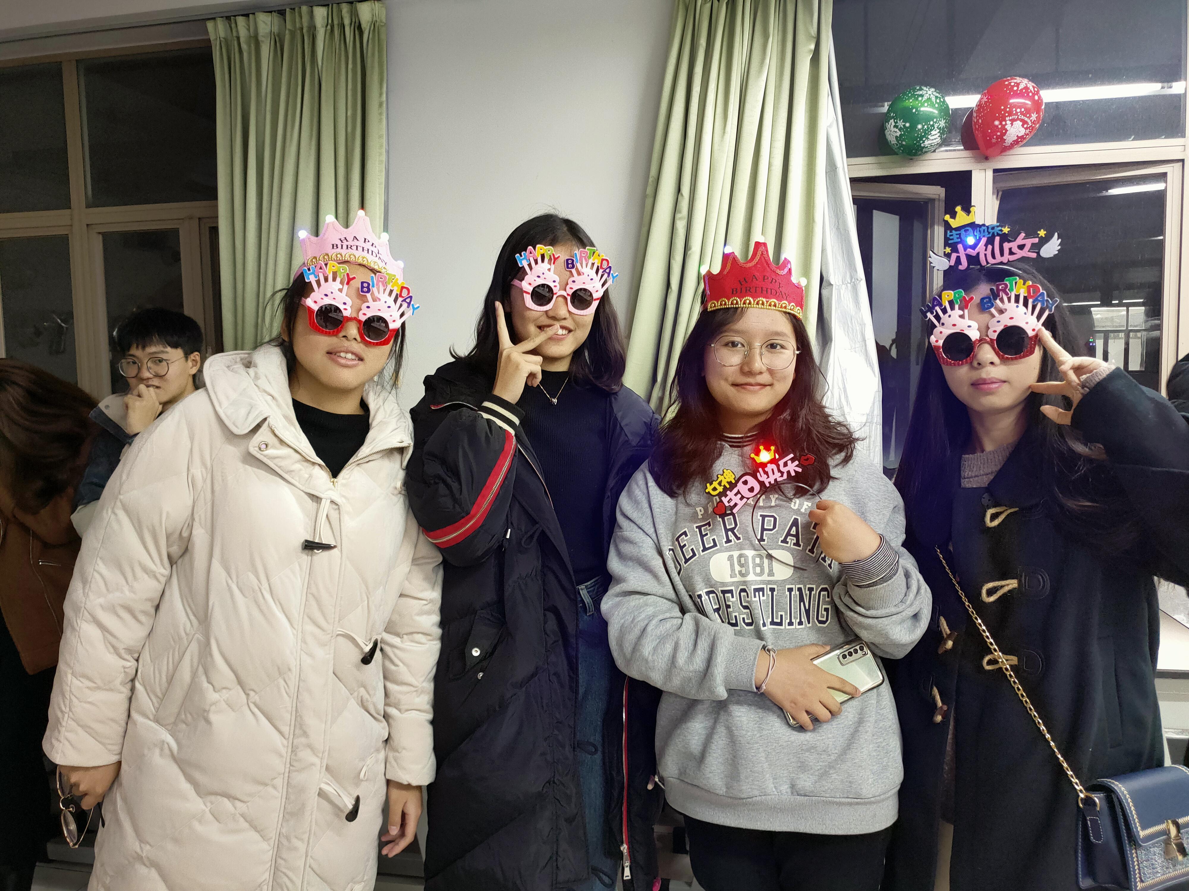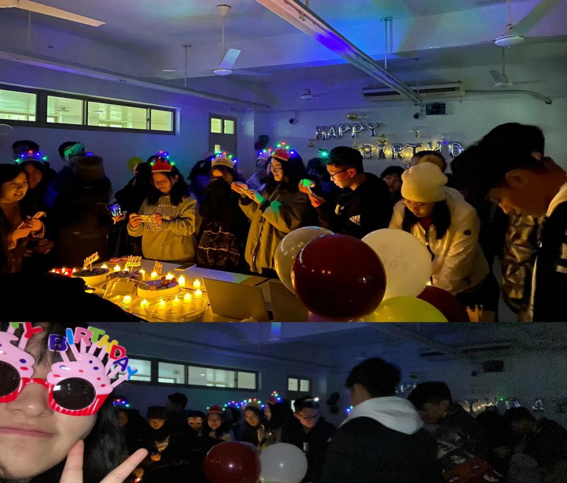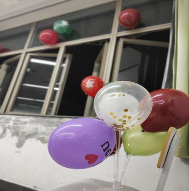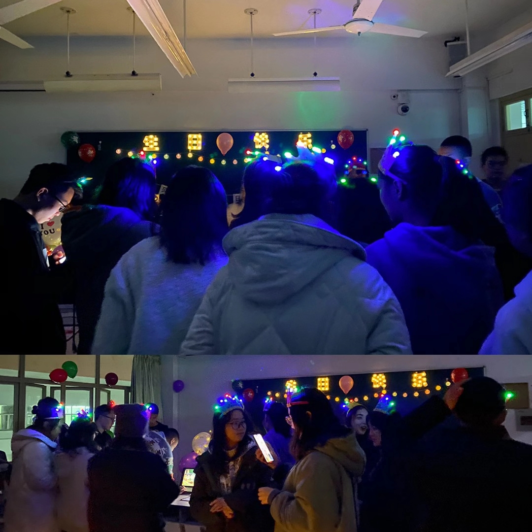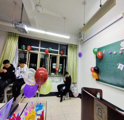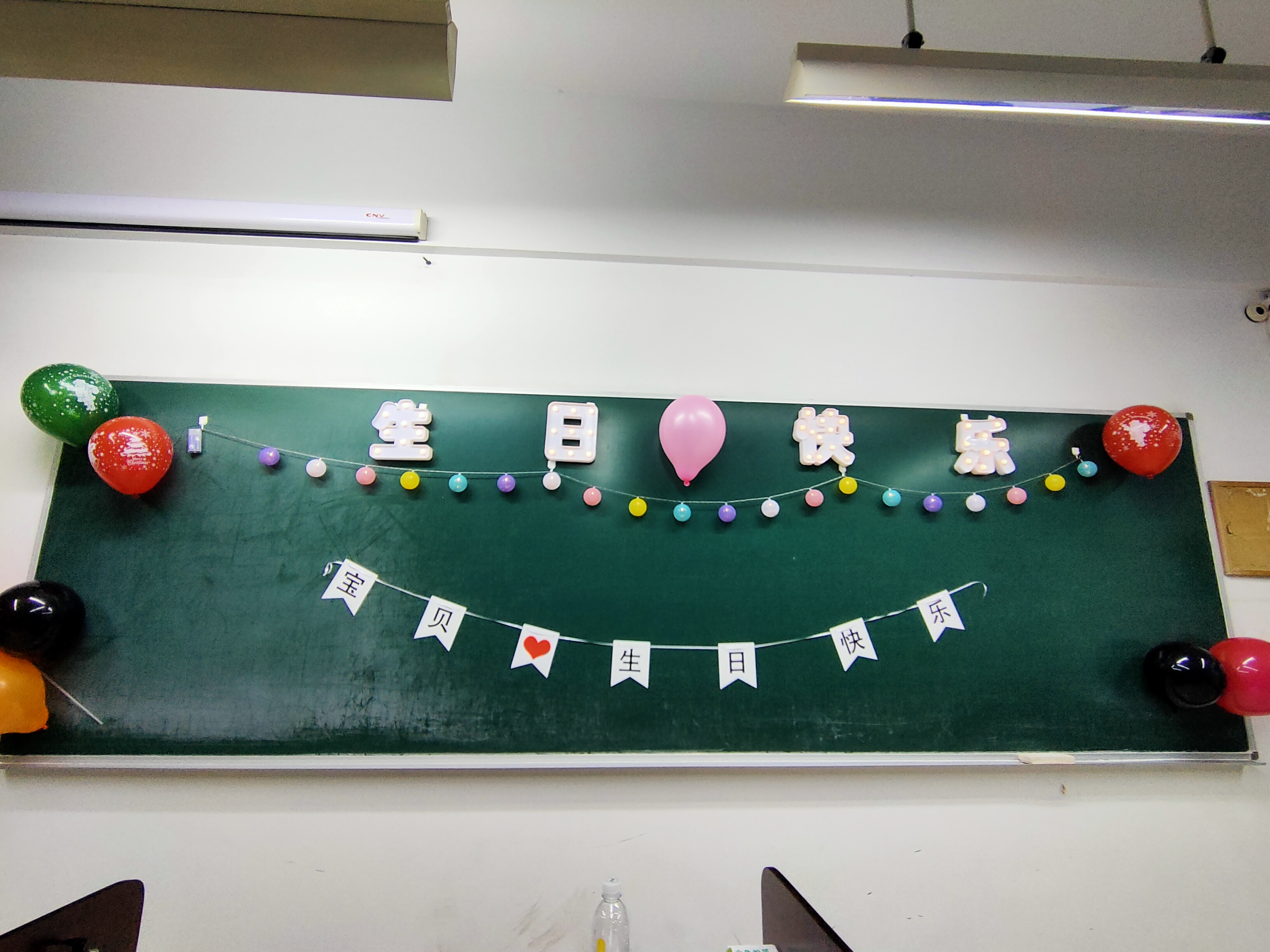 下午五點半開始同學們已經在教室進行布置了,給五顏六色的氣球打氣、在地上擺上愛心形狀的蠟燭、在墻和窗戶貼上生日快樂字樣的卡片......大家在班委的組織下互相幫助、有條不紊地裝扮教室,給壽星們準備一個完美的生日會。在將近兩個小時的精心布置下,整個教室變得溫馨而溫暖,大家已經迫不及待想要開始這場特殊的生日聚會了。