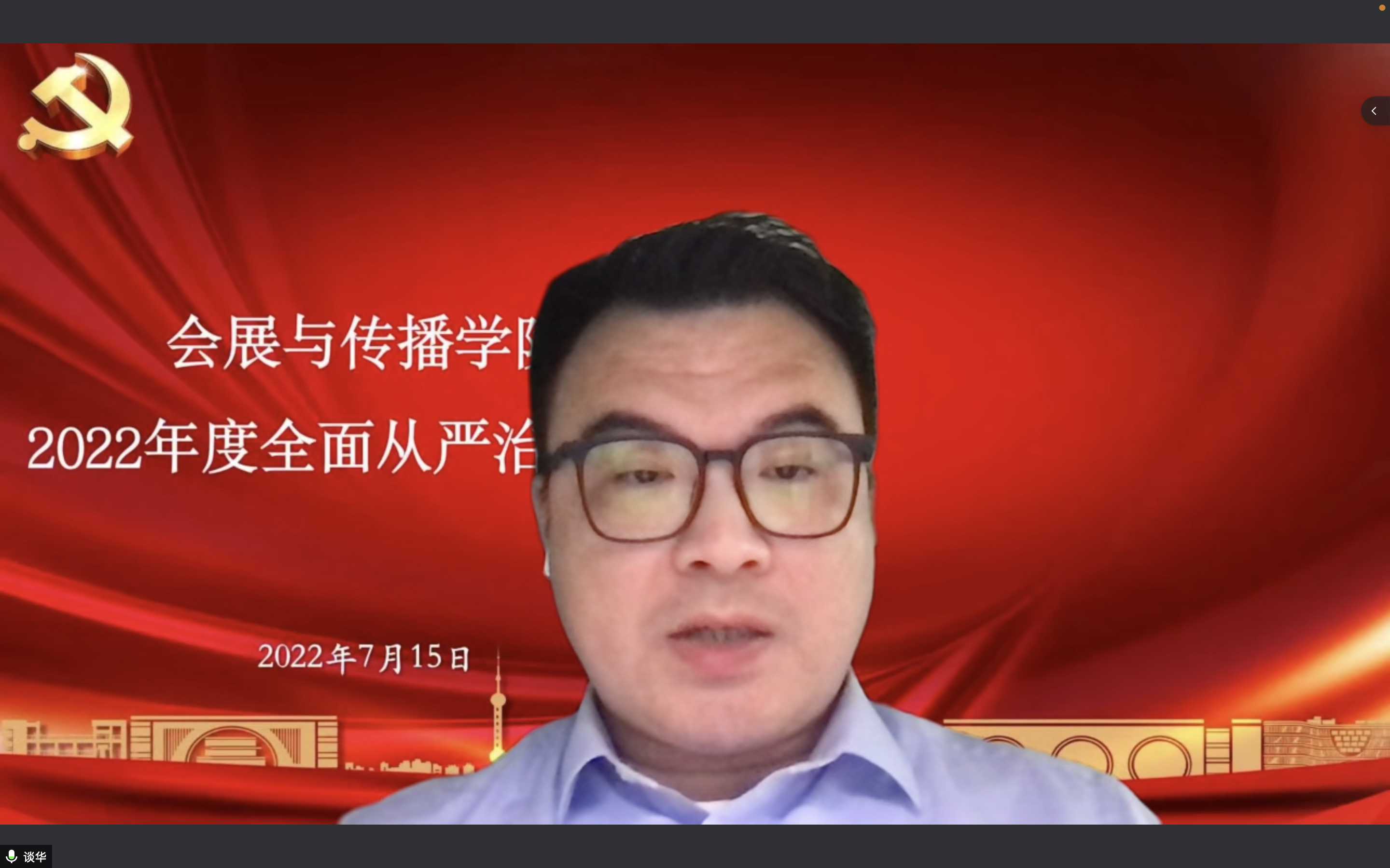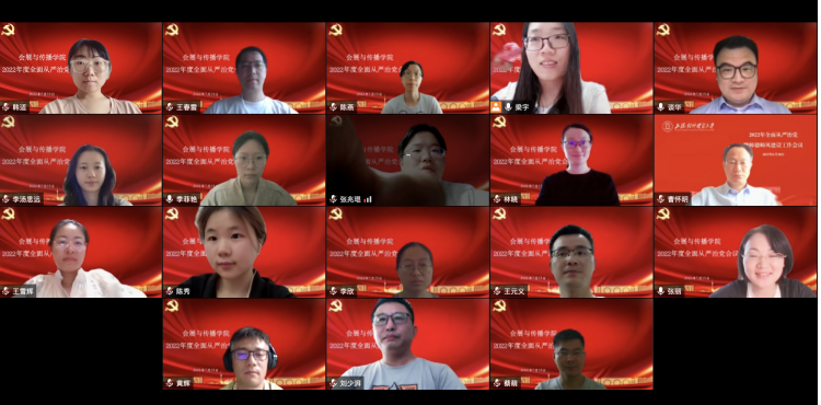 7月15日下午,會展與傳播學院黨總支在線召開2022年全面從嚴治黨會議,深入學習貫徹落實十九屆中央紀委六次全會、上海市第十二次黨代會、十一屆上海市紀委六次全會和學校2022年全面從嚴治黨暨師德師風建設工作會議精神,學院黨政班子成員,系主任、黨支部書記、紀檢委員、學院辦公室主任、組織員參加會議,會議由學院黨總支書記談華主持。