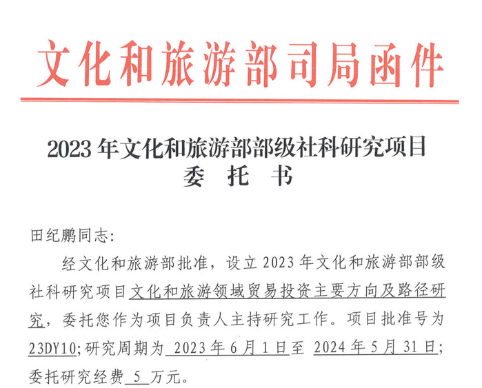 近日文化和旅游部科技教育司正式公布了2023年文化和旅游部部級社科研究項目立項委托書,田紀鵬副教授負責申報的《文化和旅游領域貿(mào)易投資主要方向及路徑研究》(23DY10)獲批立項。