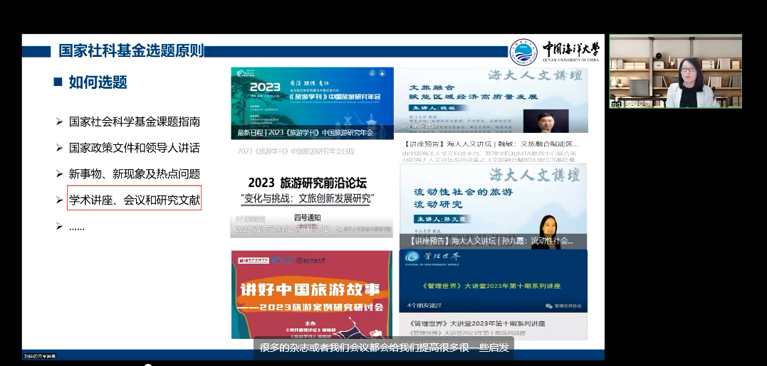 劉佳教授現(xiàn)任中國海洋大學(xué)管理學(xué)院旅游學(xué)系副主任、MTA教育中心副主任、中國自然資源學(xué)會旅游資源研究專業(yè)委員會委員等職務(wù),入選文旅部首批旅游業(yè)高級青年專家,主持完成/在研國家社科/自科課題5項,在中國1978-2018年“旅游論文作者學(xué)術(shù)影響力TOP100”中位列第14位。劉教授從國家級課題選題、國家級課題申報要點與論證細(xì)節(jié)、國家級課題建設(shè)思路與相關(guān)思考等三個各方面,結(jié)合自己的課題申建經(jīng)驗,進(jìn)行了深入淺出的講解。講座著重分析了國家自科與社科課題申請書各部分撰寫的差異性,具有很強(qiáng)的示范性和可操作性。