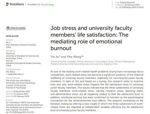 近日,我院王易可博士作為通訊作者撰寫的論文“Job stress and university faculty members' life satisfaction: The mediating role of emotional burnout”在《Frontiers in Psychology》期刊在線發(fā)表。《Frontiers in Psychology》為心理學(xué)領(lǐng)域國際知名的SSCI一區(qū)期刊。
