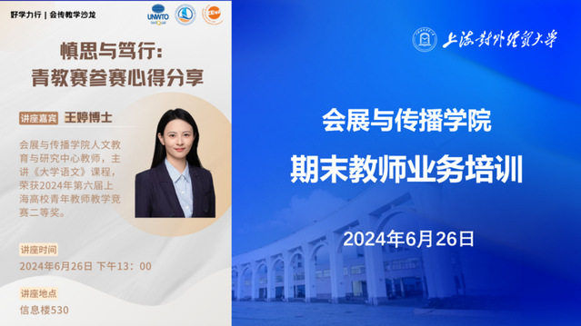 6月26日下午,會展與傳播學院期末教師業務培訓會在信息樓530順利舉行,會議邀請了會展與傳播學院人文教育與研究中心的青年教師、2024年第六屆上海高校青年教師教學競賽二等獎獲得者王婷博士,聚焦“青教賽”備賽與參賽心得,與全院教師進行分享和互動。會議由教學副院長葉青青主持。