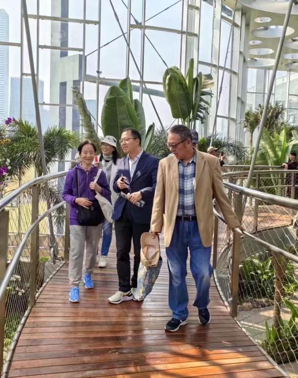 隨后老同志們來到了雙子山,雙子山由48米高的主峰和37米高的次峰組成,山體遍布喬木,郁郁蔥蔥,綠意盎然。老同志們沿著盤山步道來到山頂觀景平臺登高望遠,山腳下亞洲最大溫室花園、中心湖、十一孔橋景觀、遠處的城市天際線和盧浦大橋、南北高架以及黃浦江兩岸美景盡收眼底。
