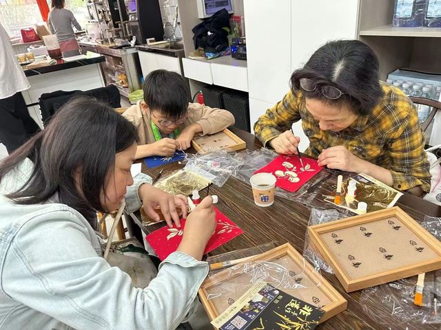 上經貿大師生團隊精心準備了非遺金箔畫和平安香囊兩項手工活動。社區居民在同學們的悉心指導下親手體驗了傳統手工藝的魅力。活動現場洋溢著溫馨與熱情,居民們專注地制作,并互相分享制作技巧,共同完成了一件件精美的手工作品。