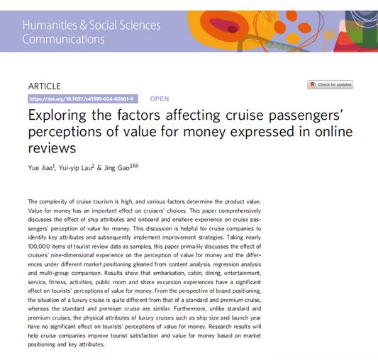 近日,我院高靜副教授作為通訊作者撰寫的論文《Exploring the factors affecting cruise passengers’ perceptions of value for money expressed in online reviews 》在《Humanities & Social Sciences Communications》期刊發表。