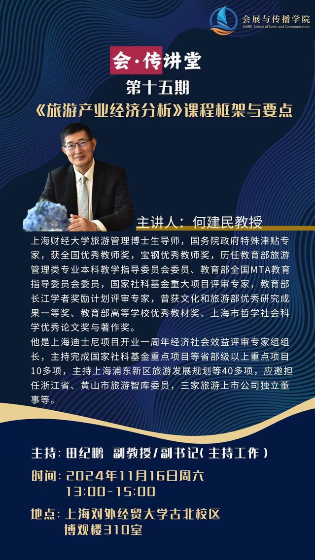 為提升旅游管理專業研究生對旅游產業經濟的分析能力,會展與傳播學院于11月16日邀請上海財經大學何建民教授帶來《旅游產業經濟分析—基本框架及重要原理與應用的案例分析》專題講座。全體旅游管理學碩和專碩(MTA,全日制/非全)同學參加,講座由學院黨委副書記(主持工作)田紀鵬主持。