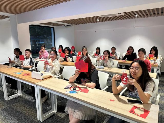 本次活動還設(shè)置了剪紙體驗環(huán)節(jié),讓同學(xué)們親身感受非遺技藝的魅力。大家手持剪刀,全神貫注地在紅紙上裁剪出精美的圖案,靈動的線條與對稱的構(gòu)圖展現(xiàn)了海派剪紙的獨特韻味。同學(xué)們在動手實踐中不僅體會到傳統(tǒng)手工藝的精妙,也用自己的創(chuàng)意為剪紙藝術(shù)注入了現(xiàn)代活力,體現(xiàn)了非遺文化的當(dāng)代價值。