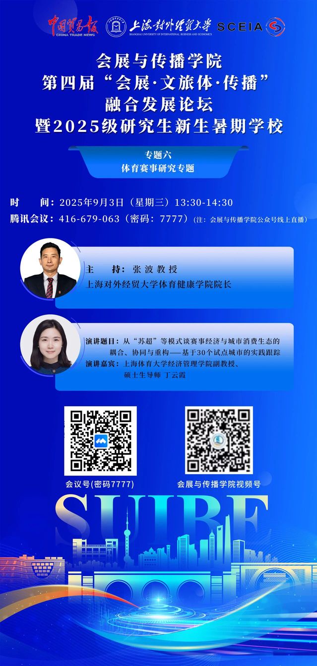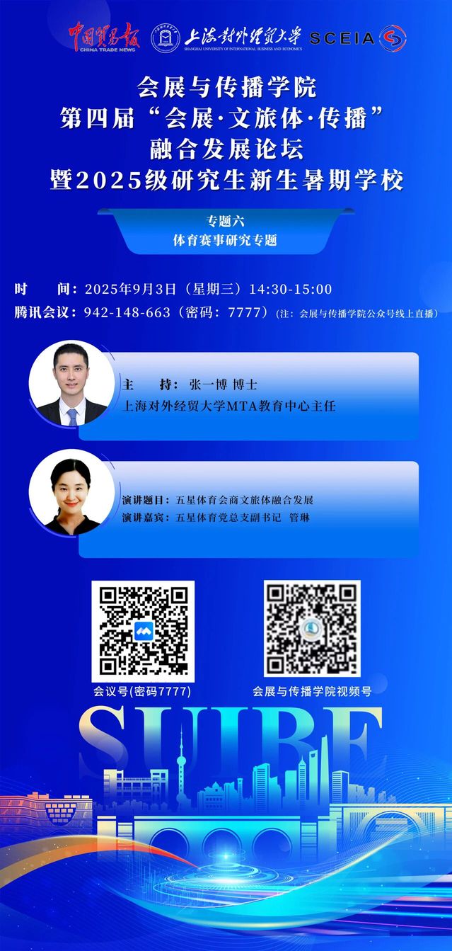 9月3日,由上海對外經貿大學、《中國貿易報》社和上海市會展行業協會聯合主辦,會展與傳播學院、校研究生院、體育健康學院和長三角會展研究院聯合承辦,五星體育傳媒有限公司協同舉辦的2025第四屆“會展·文旅體·傳播”融合發展論壇暨2025級研究生新生暑期學校的融合發展論壇板塊“專題六:體育賽事研究專題”在線順利舉行。上海體育大學經濟管理學院副教授、碩士生導師 丁云霞,五星體育黨總支副書記管琳擔任兩場主旨演講嘉賓。論壇分別由上海對外經貿大學體育健康學院院長張波教授、MTA教育中心主任張一博博士擔任主持。