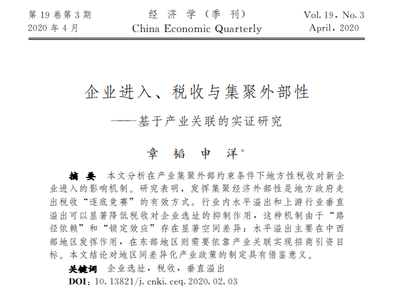 我院經濟系副教授章韜老師的論文在國內權威期刊《經濟學(季刊)》(Vol.19,No.3)發表,題為《企業進入、稅收與集聚外部性——基于產業關聯的實證研究》,章韜副教授為本文第一作者。