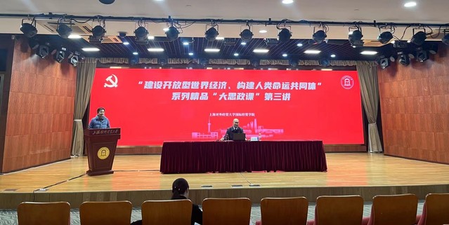 11月29日下午,“建設(shè)開放型世界經(jīng)濟(jì)、構(gòu)建人類命運(yùn)共同體”系列精品“大思政課”第三講在松江校區(qū)信息樓507報(bào)告廳如期舉行。國(guó)際經(jīng)貿(mào)學(xué)院院長(zhǎng)何歡浪教授主持,課程采取線上線下相結(jié)合的方式進(jìn)行,學(xué)院師生代表及校內(nèi)外4600余名觀眾共同聆聽。