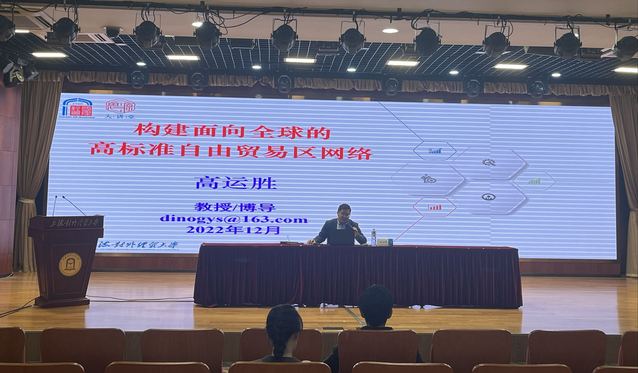 “大思政課”第四講由國際經貿學院高運勝教授主講,主題為《構建面向全球的高標準自由貿易區(qū)網絡》。他開篇以“如何利用RCEP規(guī)則開展貿易”案例切入,重點圍繞“近階段全球與我國經濟貿易發(fā)展趨勢”“新冠疫情與產業(yè)鏈重構帶來的沖擊”“多邊貿易困境與區(qū)域貿易協(xié)定進展”“高標準自由貿易區(qū)網絡構建”四個方面進行深入闡釋。他指出構建高標準自貿區(qū)網絡,有助于增強國內國際經濟聯(lián)動效應,提升國際循環(huán)質量和水平,推動更高層次、更高水平的開放戰(zhàn)略,從而推動國內改革,形成開放型經濟制度體系。他強調構建面向全球高標準自貿協(xié)定網絡,未來還需從國企改革、知識產權保護、勞工標準、環(huán)境保護和數(shù)據(jù)流動等方面積極貢獻中國智慧,提供中國方案。