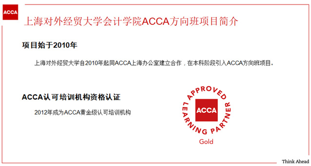 上海對外經(jīng)貿(mào)大學ACCA項目的13門核心課程均采用國際同步最新的英文原版教材,實施雙語或全英語教學。由學院中青年骨干教師承擔所有課程的教學與培養(yǎng)。會計學院本科新生可通過自愿報名、擇優(yōu)選拔的形式進入該項目學習,完成課程并通過ACCA全球統(tǒng)一考試者可以獲得“英國皇家特許會計師”資格證書,并成為ACCA會員。