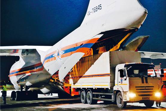 2020年2月8日,在俄羅斯莫斯科附近的茹科夫斯基機場,工作人員將俄羅斯政府向中方提供的醫療援助物資裝上運輸機。新華社/衛星社