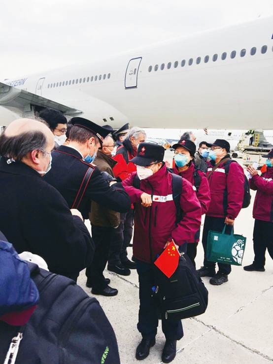 2020年3月25日,在意大利米蘭馬爾奔薩機場,意方人員以“擊肘”的方式歡迎中國第三批赴意大利抗疫醫療專家組成員的到來。中國第三批赴意大利抗疫醫療專家組一行14人25日抵達米蘭馬爾奔薩機場。專家組由國家衛生健康委員會組建,成員由福建省衛健委選派,并隨所乘飛機攜帶了呼吸機、監護儀、口罩等中方捐助的醫療物資。新華社發