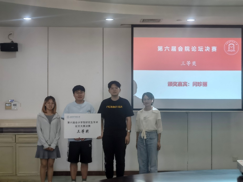 為進一步營造濃厚的研究生科研創新氛圍、強化研究生創新意識、應用創新能力、學術思維和研究水平,會計學院于623日下午,在信息樓501圓形報告廳隆重召開第六屆“學術為魂,見證未來”會院論壇學術征文大賽決賽暨 “毓秀”研究生創新項目資助計劃立項頒證儀式。會計學院副院長楊慧輝教授、審計系副系主任陳麗英副教授、會計系教工黨支部書記何開剛博士、青年教師閆珍麗博士、以及研究生會書記譚海楨老師出席本次活動。
