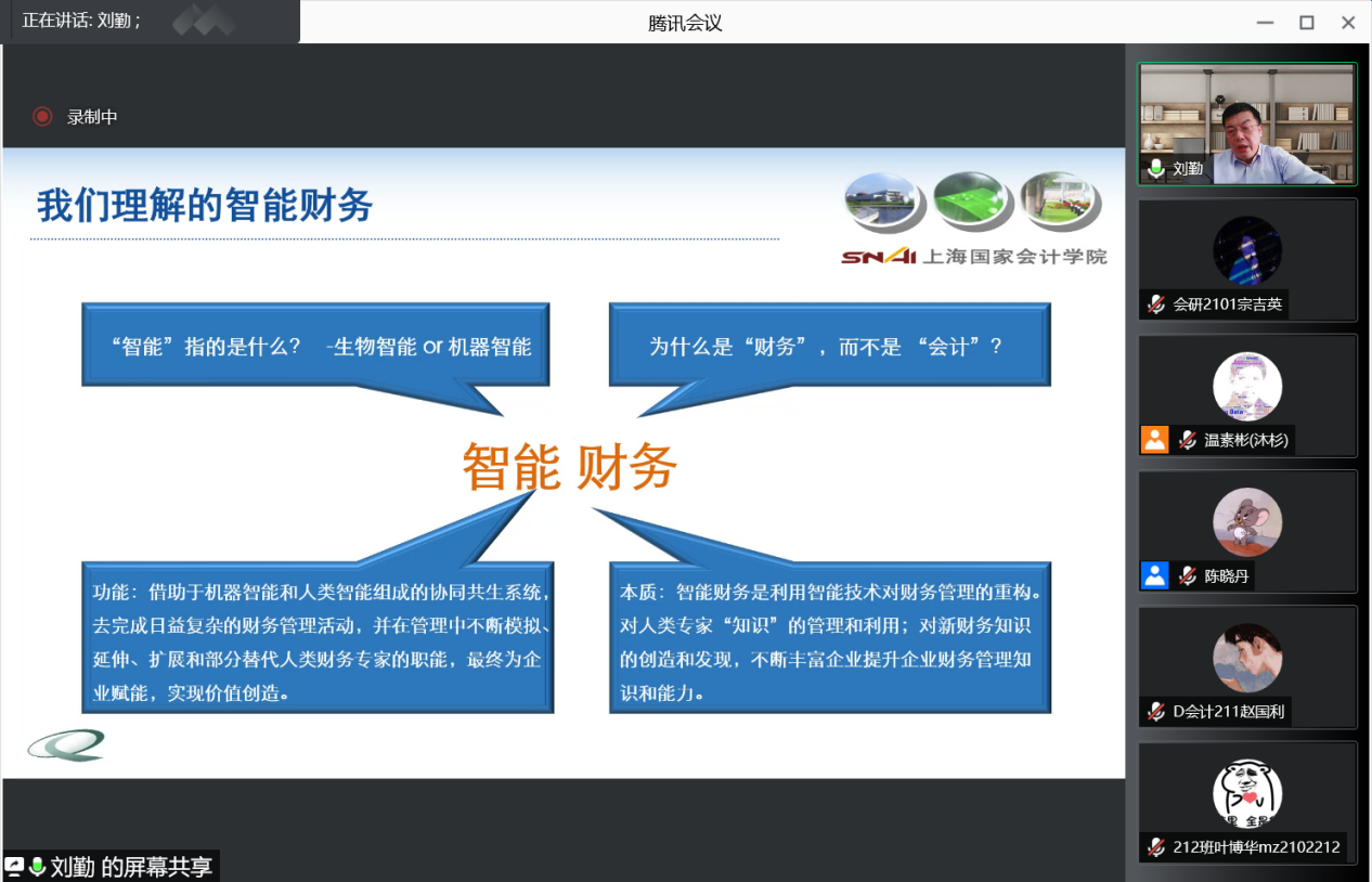 10月14日下午,上海國(guó)家會(huì)計(jì)學(xué)院黨委副書記、副院長(zhǎng)、博士生導(dǎo)師劉勤教授通過騰訊會(huì)議面向南京審計(jì)大學(xué)會(huì)計(jì)學(xué)院學(xué)生和我院研究生開展了一場(chǎng)主題為“智能財(cái)務(wù)理論與實(shí)踐”的學(xué)術(shù)講座。本次講座是財(cái)會(huì)審智能化推進(jìn)聯(lián)盟單位之間的優(yōu)質(zhì)講座資源共享,學(xué)院2020級(jí)和2019級(jí)研究生在貿(mào)源樓414、2021級(jí)研究生在云端,共同聆聽了這場(chǎng)講座。