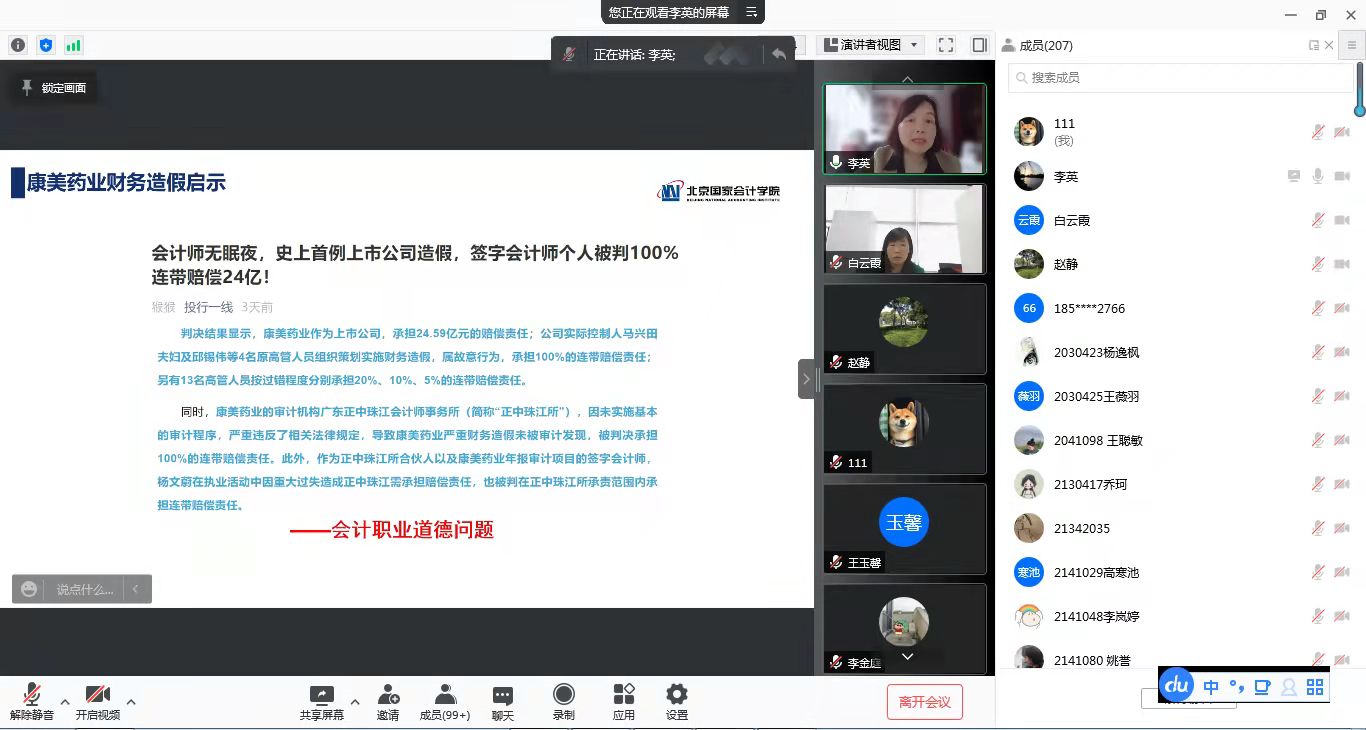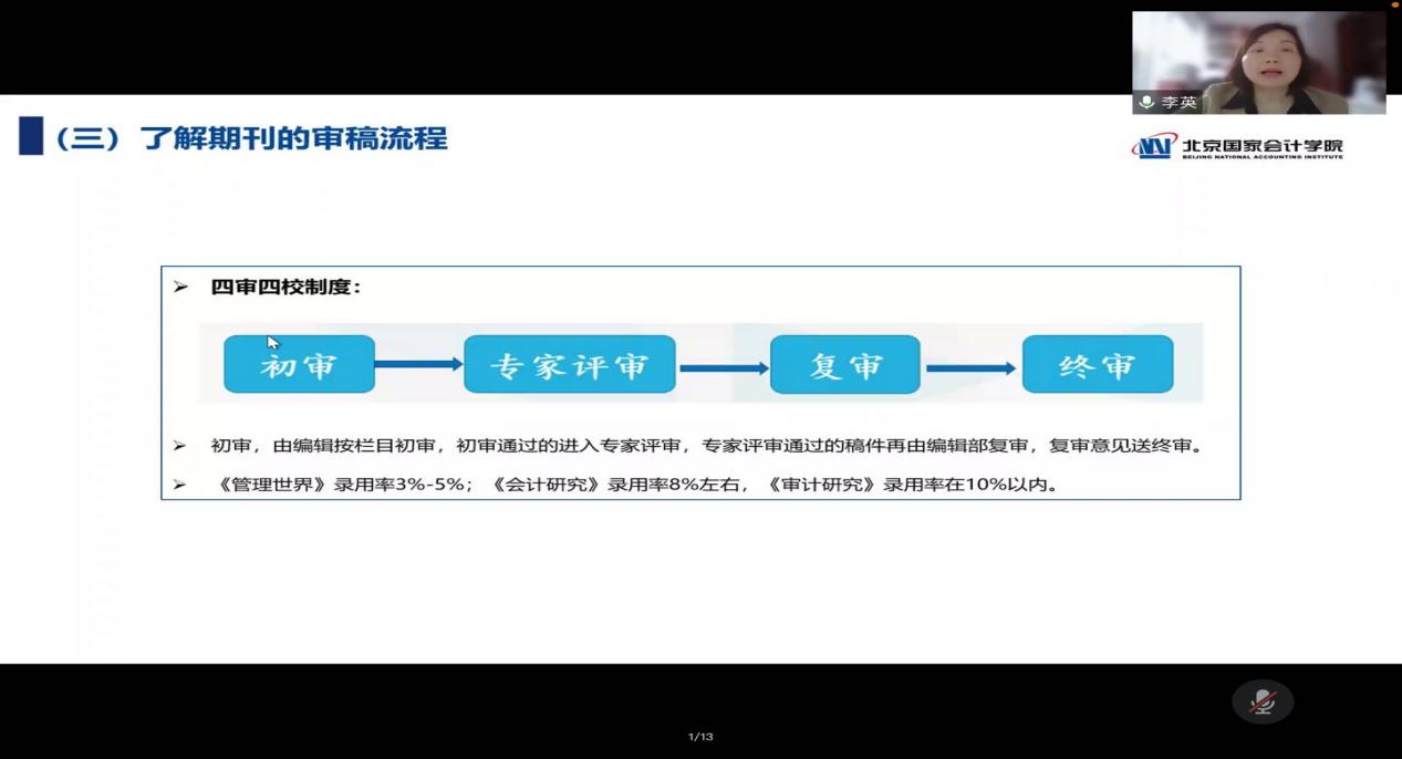 11月16日下午,北京國家會計學院副教授、碩士研究生導師李英通過騰訊會議面向同濟大學經濟與管理學院學生和我院研究生開展了一場主題為“會計理論創新”的學術講座。本次講座是財會審智能化推進聯盟單位之間的優質講座資源共享,學院研究生在線聆聽了這場講座。本次講座內容圍繞會計理論研究時代背景、基礎科學進步與會計理論創新、會計理論和方法體系的反思、選題設計和提高投稿命中率的技巧五個方面展開。