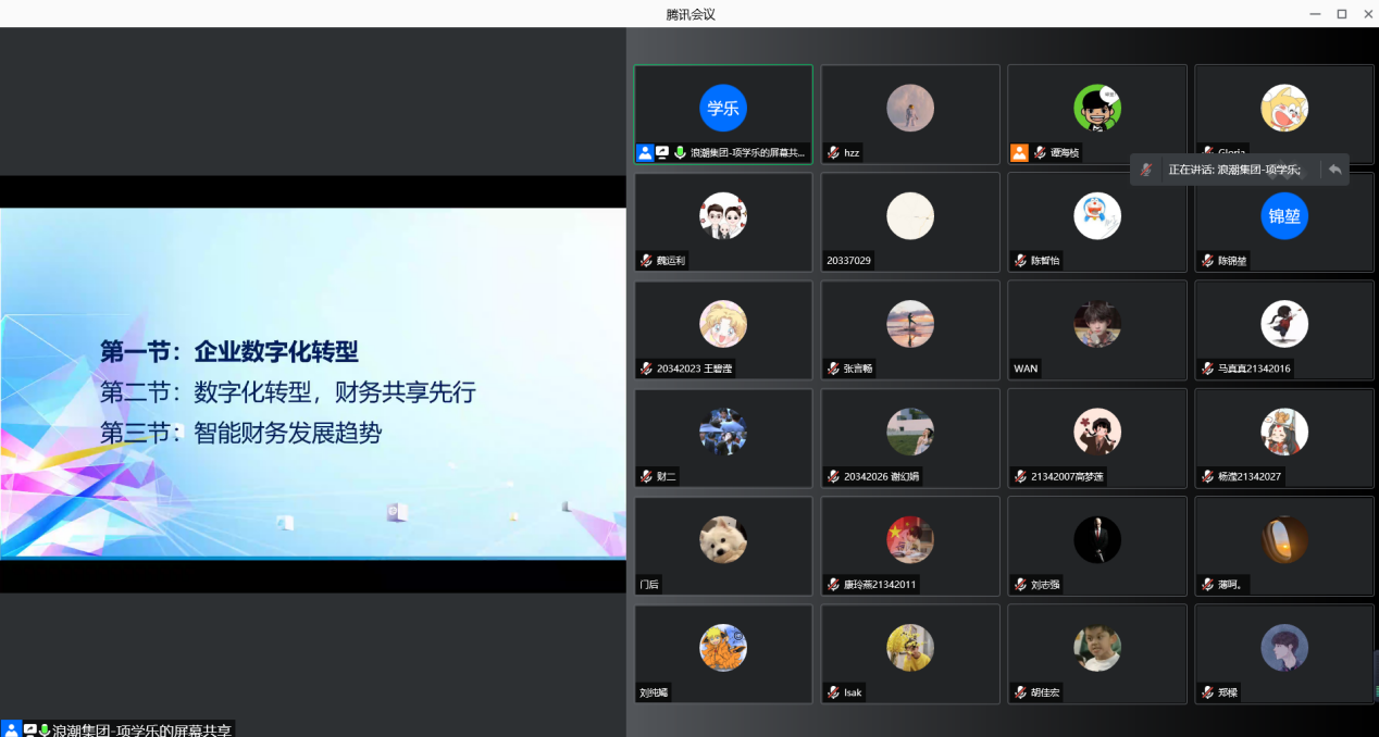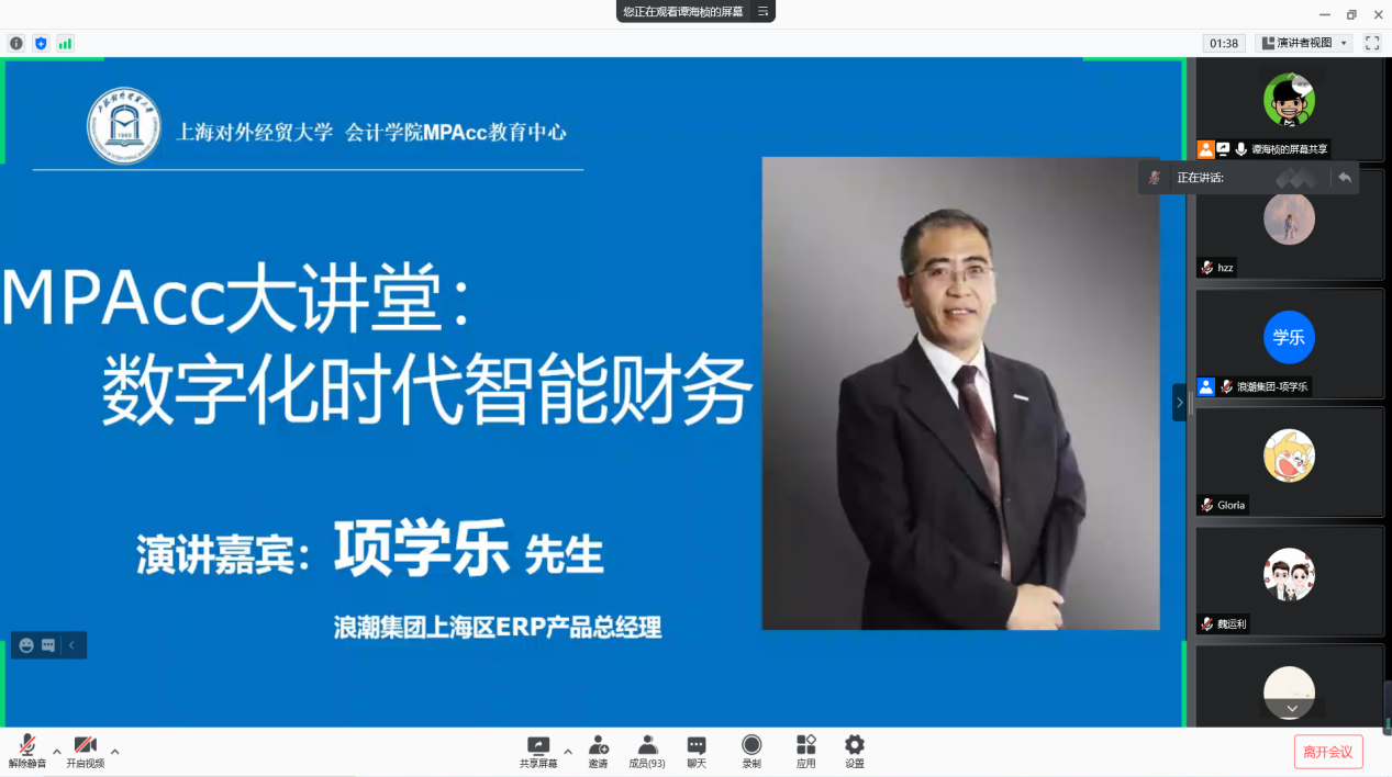 11月22日晚,浪潮集團(tuán)上海區(qū)ERP產(chǎn)品總經(jīng)理項(xiàng)學(xué)樂先生通過騰訊會(huì)議面向我院研究生開展了一場主題為“數(shù)字化時(shí)代智能財(cái)務(wù)”的講座。項(xiàng)學(xué)樂先生曾任浪潮財(cái)務(wù)共享產(chǎn)品部總經(jīng)理,擁有非常豐富的項(xiàng)目經(jīng)驗(yàn),設(shè)計(jì)開發(fā)了浪潮財(cái)務(wù)共享產(chǎn)品GS6.0,并在眾多大型企業(yè)集團(tuán)應(yīng)用推廣。本次講座由MPAcc中心副主任譚海楨老師主持,學(xué)院近百名研究生在線聆聽了這場講座。