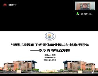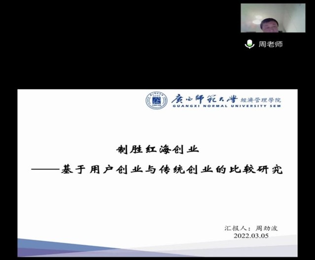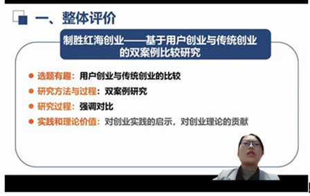 交流會內容由論文分享和教授討論點評兩部分組成。廣西師范大學周勁波教授、西南科技大學張霜教授分別從研究背景、文獻綜述、研究設計、案例分析、研究啟示等方面做了《制勝紅海創業——基于用戶創業與傳統創業的雙案例比較研究》以及《資源拼湊視角下場景化商業模式創新路徑研究——以冰青青梅酒為例》的論文匯報。